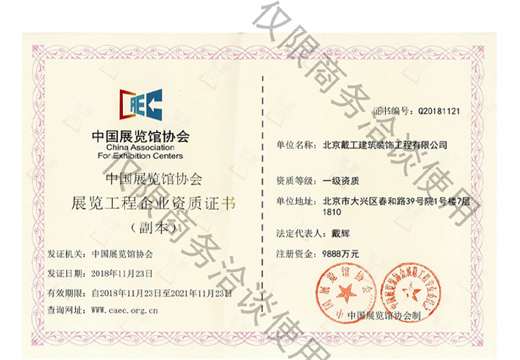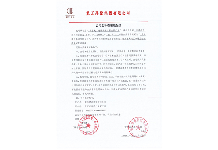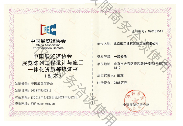 戴工建設(shè)集團(tuán)有限公司,創(chuàng)建于2009年,注冊(cè)資本9888萬(wàn)元人民幣。公司位于北京市大興區(qū)。具有建委頒發(fā)的建筑裝飾裝修專(zhuān)業(yè)壹級(jí),防水保溫工程專(zhuān)業(yè)壹級(jí),建筑幕墻專(zhuān)業(yè)貳級(jí),消防設(shè)施專(zhuān)業(yè)貳級(jí),電子與智能化專(zhuān)業(yè)貳級(jí),特種工程(結(jié)構(gòu)補(bǔ)強(qiáng))專(zhuān)業(yè)不分等級(jí),建筑機(jī)電安裝專(zhuān)業(yè)貳級(jí),環(huán)保工程專(zhuān)業(yè)貳級(jí),鋼結(jié)構(gòu)專(zhuān)業(yè)貳級(jí),建筑工程總承包貳級(jí),建筑裝飾工程設(shè)計(jì)專(zhuān)項(xiàng)甲級(jí),展覽陳列工程設(shè)計(jì)與施工壹級(jí),展覽展示工程壹級(jí)...更多>>