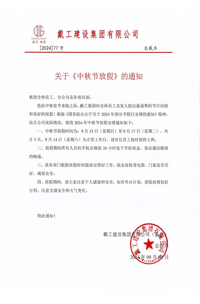 在此,戴工集團(tuán)再次向全體員工及家人致以最誠(chéng)摯的中秋祝福!愿大家在這個(gè)團(tuán)圓的日子里與家人共度美好時(shí)光,同時(shí)也期待大家以更加飽滿的熱情和充沛的精力投入到后續(xù)的工作中,共同推動(dòng)公司的發(fā)展邁上新的臺(tái)階!